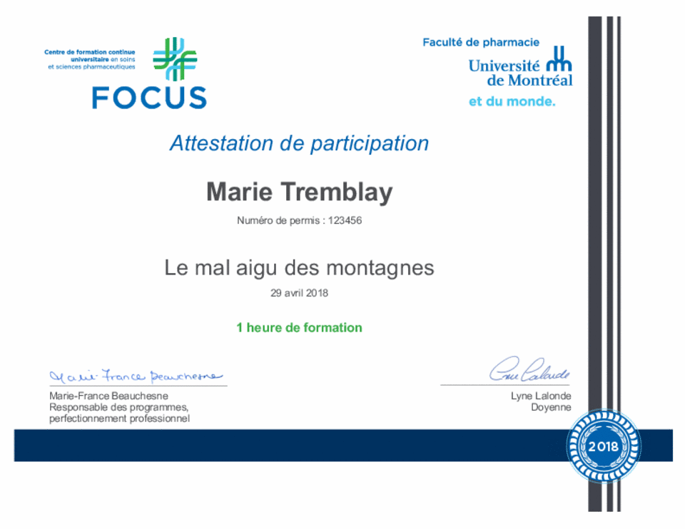 | Une attestation et un plan de formation vous seront remis automatiquement pour la déclaration de vos heures de formation admissibles auprès de l’OPQ. Pour les cours avec crédits universitaires, la réussite au bulletin constituera votre attestation. | ![]() |
