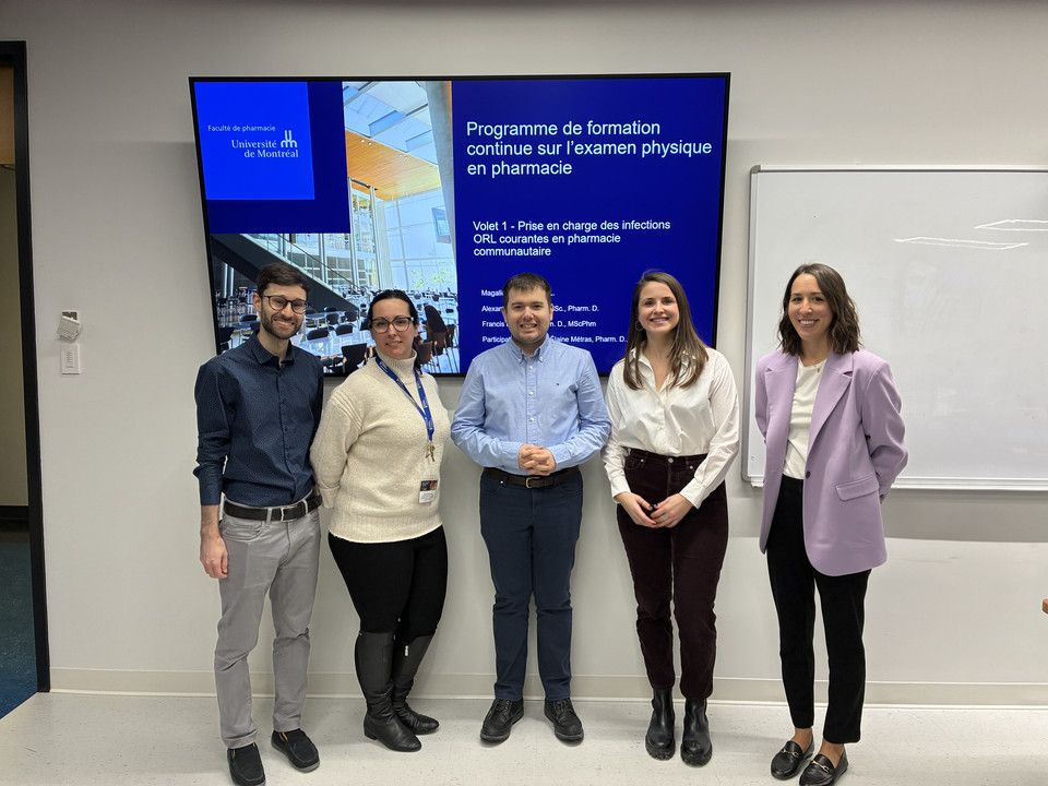 | Simon de Denus (doyen), Elyse Desmeules (directrice principale, services professionnelles Québec & soins cliniques en pharmacie, Pharmaprix), Rougietta Touré (gestionnaire principale des programmes nationaux, Pharmasupport) et Marie-France Beauchesne (responsable du Centre FOCUS) | Notre équipe : Alexandre Chadi, Karen Oliveira Jesus, Francis Richard, Alexandra Dussault et Magalie Legault (Chantal Breton non présente sur la photo) |