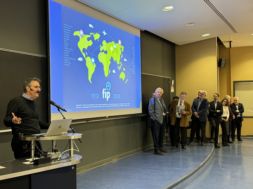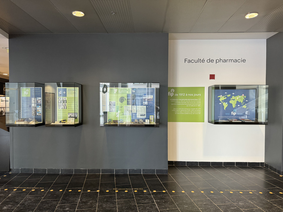![]() | Cette exposition est organisée par le professeur titulaire de clinique Jean-François Bussières, responsable du fonds historique, avec la collaboration de Rachel Vincent, coordonnatrice multimédia, et avec la contribution d'étudiants de l'Unité de recherche en pratique pharmaceutique (Louise Lardeux, Clarisse Martin, Beyza Ozkan, Antoine Théron, Cassandra Mani, Léo Miri). Au fil du temps, plusieurs pharmaciens québécois se sont impliqués en participant aux congrès, en présentant des communications affichées et orales, en publiant des articles et en agissant, pour certains, comme officiers de la FIP. Trois d'entre eux ont été reconnus comme fellow de la FIP, soit Pierre Moreau, Régis Vaillancourt et Sylvain Grenier. Cette exposition sera présentée de décembre 2025 à novembre 2026. Notons que la FIP tiendra son congrès mondial à Montréal du 31 août au 5 septembre 2026. On peut consulter un article synthèse publié dans le cadre de l'exposition ainsi qu'une vidéo souvenir de l'inauguration.