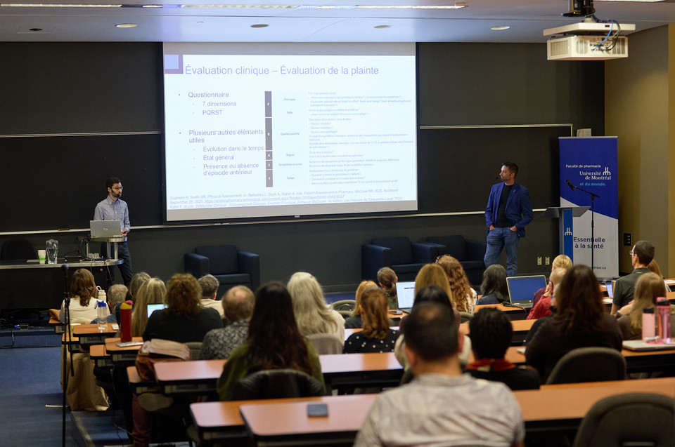 Alexandre Chadi et Nicolas Dugré ont par la suite discuté de l’importance grandissante de l’examen physique pour les pharmaciens et pharmaciennes du Québec, en lien notamment avec les activités découlant du projet de loi 67. Ils ont notamment abordé les grands principes entourant l'utilisation de l'examen physique dans le cadre d'une évaluation clinique.