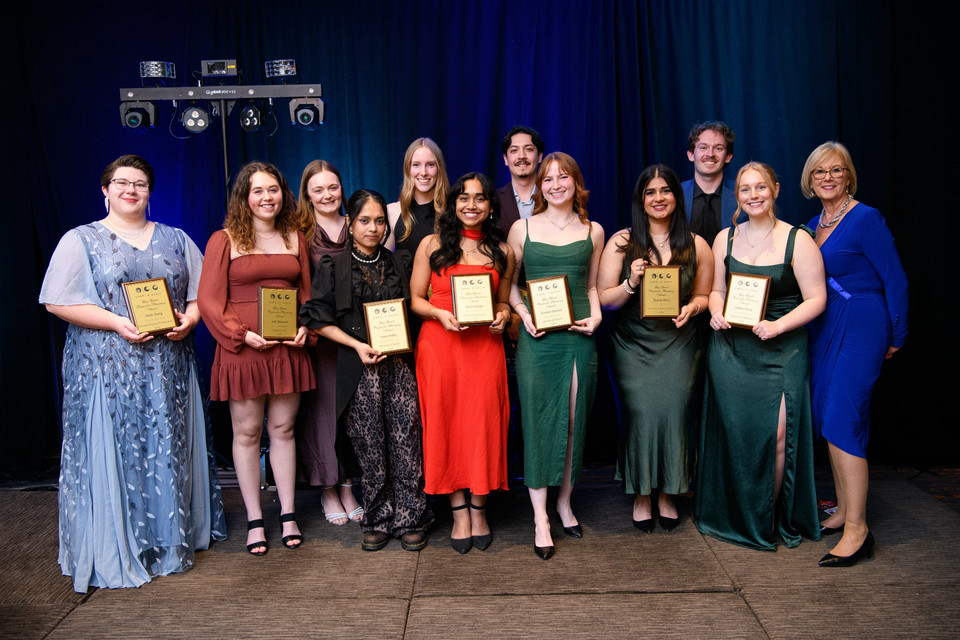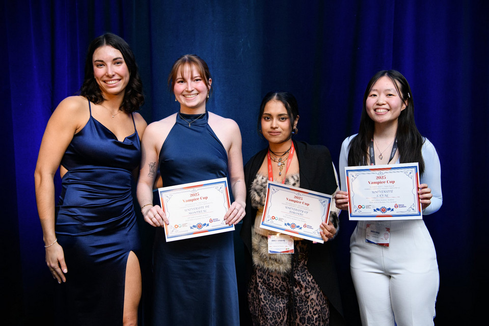 | Alexis Young (MUN), Jade Brassard (UOttawa), Elizabeth Lamarche (ULaval), Anica Shafiq (UofT), Sarah Darch (UWaterloo), Divya George (UManitoba), Carlos Zapien Verdugo (USaskatchewan), Carolane Boisvert (UMontréal), Tanisha Misra (UBC), Max Albrecht (UAlberta), Andrea Young (UDalhousie) et Linda Prytula (Directrice exécutive de Canadian Foundation for Pharmacy) | Elissa Benda, Romy Calvert, Brigitte Labbé et Aurélie Comeau |